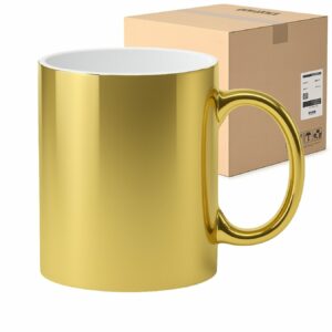 Elegancki, złoty kubek ceramiczny przeznaczony do nadruku metodą sublimacji. Idealny na ekskluzywne prezenty, gadżety firmowe i sprzedaż premium. Kubek pokryty jest specjalną warstwą polimerową, która umożliwia trwałe i pełnokolorowe przeniesienie grafiki, logo lub tekstu.
